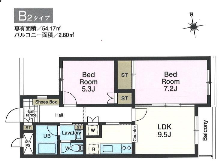 2LDK、価格2380万円、専有面積54.17m2、バルコニー面積2.8m2