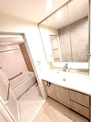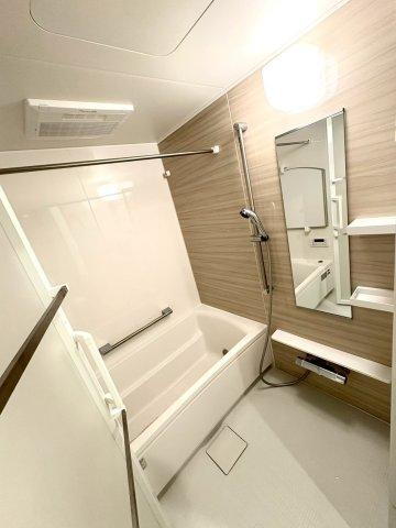 1日の疲れを癒す、洗面室・浴室は清潔感があり、落ち着いた色合いです。ドア外タオル掛けを2本設置しているところもポイントです!