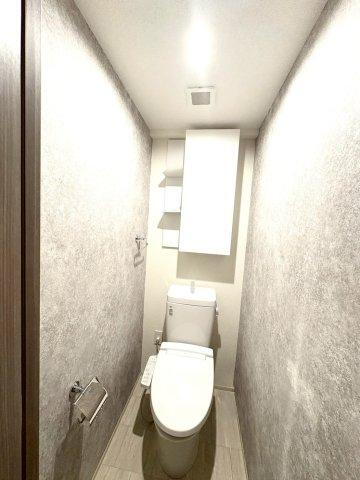 清潔感のあるトイレです。収納棚付。