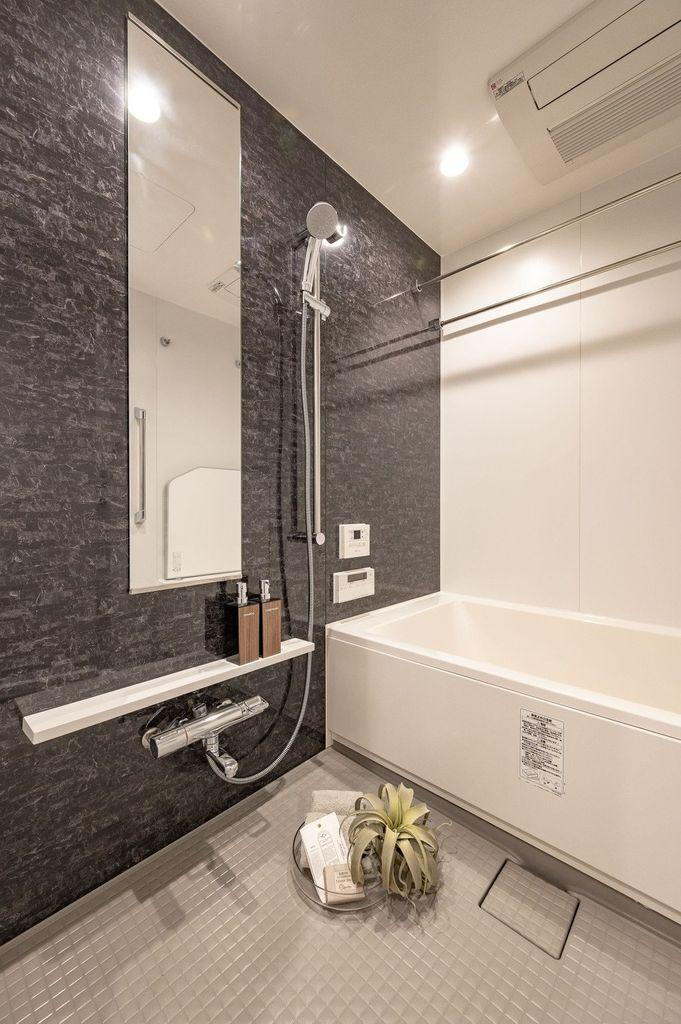 モノトーンカラーのバスルームは、落ち着いた空間となっております。日々の疲れを癒すために、半身浴や入浴剤を入れてバスタイムを楽しむことができます。癒し時間にぴったりの空間です。