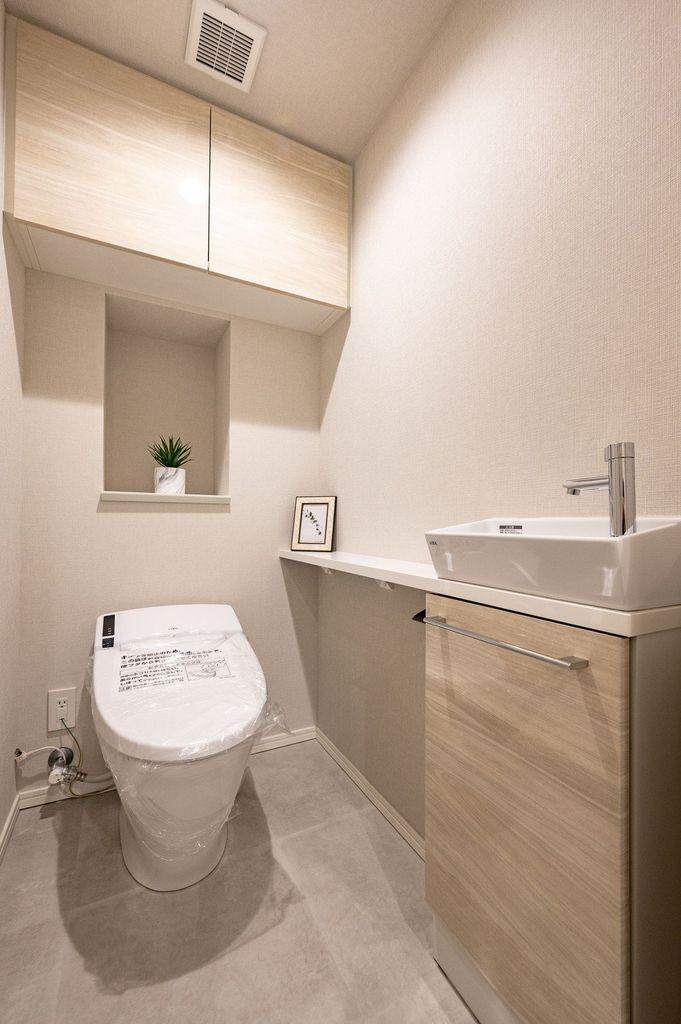 優しい色調で統一された清潔感溢れるレストルームには、タンクレストイレを設置いたしました。また吊戸棚と手洗い場があり、インテリアやフォトフレームなど飾ることができます。タンクのお掃除が不要なトイレです。