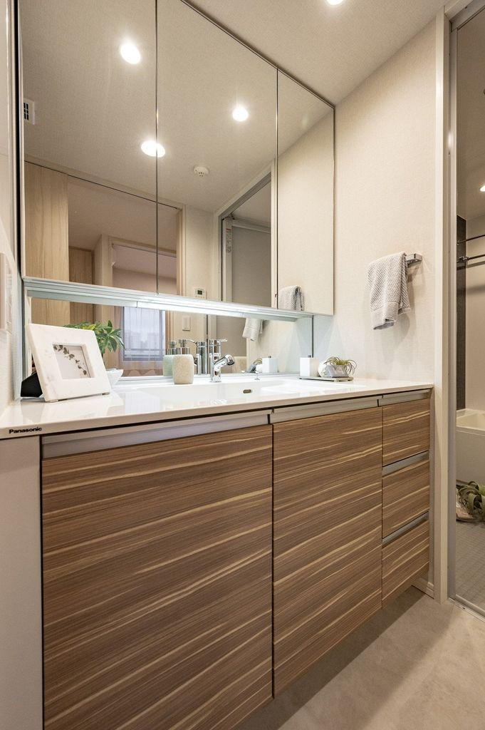 ホワイト×ベージュカラーの洗面化粧台は三面鏡裏と足元に収納棚があり、身支度グッズや日用品を収納することが可能です。広さがあるためゆったりと身支度をすることができます。