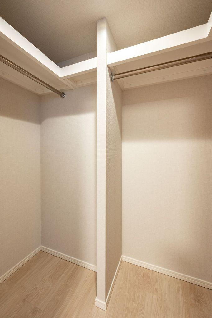 ウォークインクローゼットは2箇所あり、上部には枕棚があります。平置きグッズやファッション小物を片づけることが可能です。淡い色合いのためお洋服のカラーを確認しやすくなっております。