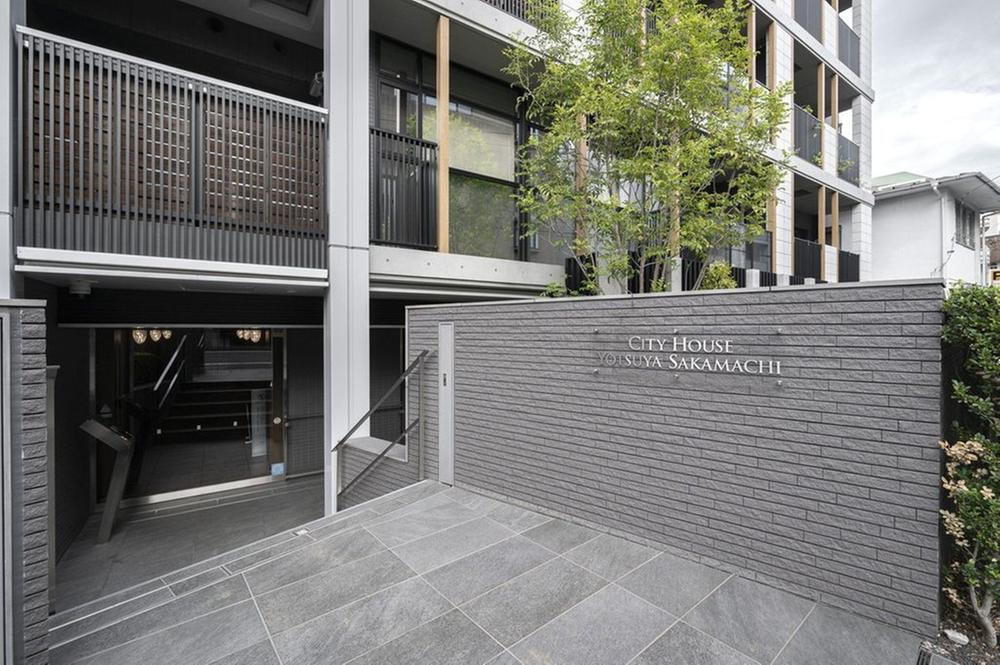 ダークトーンがアクセントとなっており、四谷坂町の趣ある住環境と調和しているエントランスです。お手入れの行き届いた植栽から、管理が行き届いていることを感じられる共用部分です。