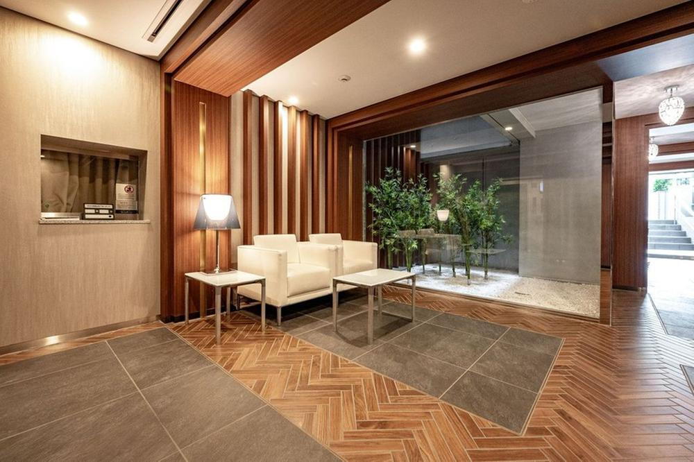 木目が美しく、ホワイトカラーのソファが美しいコントラストを彩っているエントランスロビーです。クラシカルで心地よい雰囲気を醸し出し、住まう方を安らぎの居住空間へ誘います。