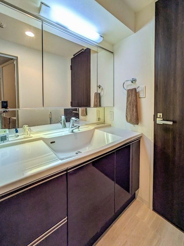 三面鏡収納付き洗面化粧台。整理整頓がしやすく、朝の身支度もスムーズに。