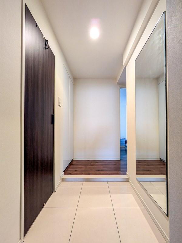 シューズインクローゼットのある玄関。お出かけ前にチェックできる姿見もあります。