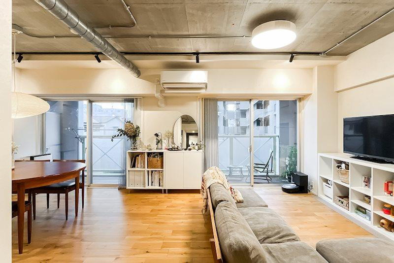 リビング/窓を背にしたカット。天井は躯体現し・床は無垢フローリングで、明るさとゆとりを感じる空間です。