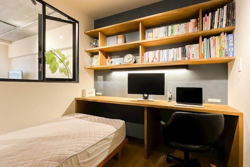 約4帖の洋室A/こちらはLDKと室内窓でつながる空間。棚とデスクが備わっており、ワークスペースのように使えます。