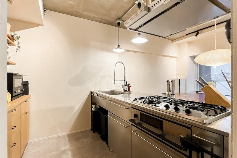 キッチン/コンロは3口タイプで、火力が強いプロ仕様に近いモデルを採用。自在に動かせるスプリング水栓付きです。