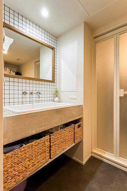 洗面室/スクエアのミラーやモールテックス仕上げのカウンターを組み合わせた、オリジナルの洗面台。壁にあしらわれた正方形のタイルも可愛いです!