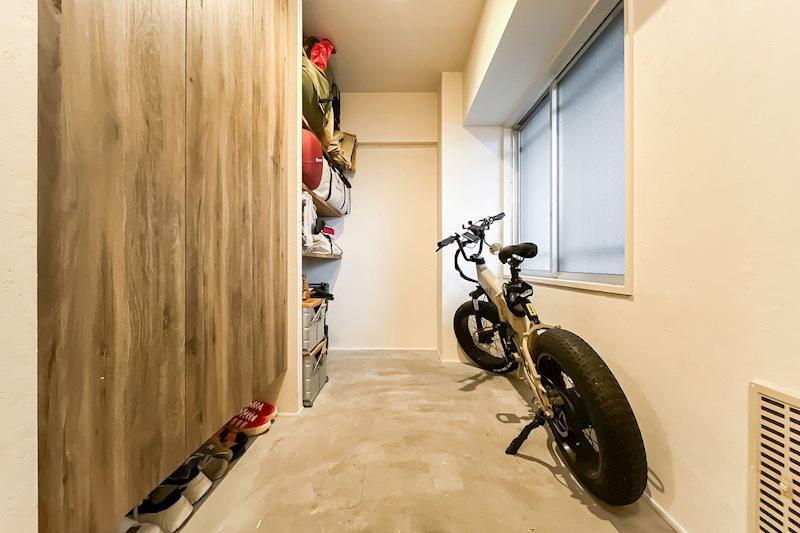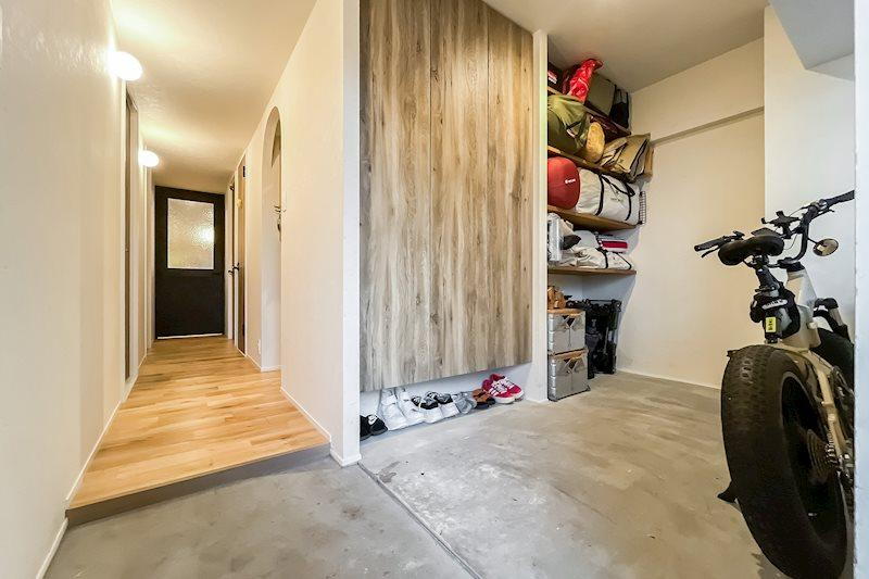 玄関土間/玄関扉を開けると、横長の大きな土間が。電動自動車やベビーカー、アウトドアのギアなど、大きなアイテムも難なく置ける広さです。