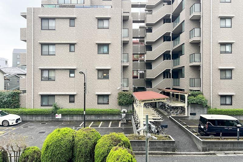 バルコニーからの眺望/正面の眺望。別の建物の窓や共用廊下が見えますが、距離が取れており視線は気にならない印象です。