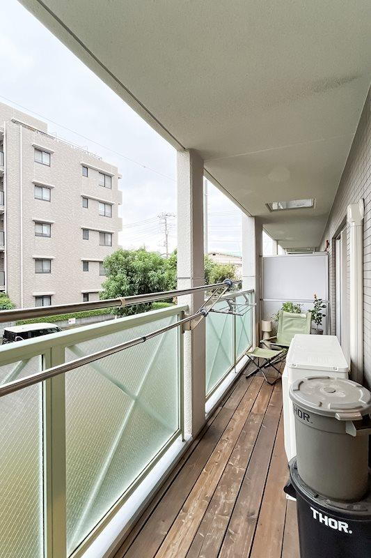 バルコニー/バルコニーは奥行きが深め。売主さまはキャンピングチェアを置いて、リラックスできる空間に仕上げています。