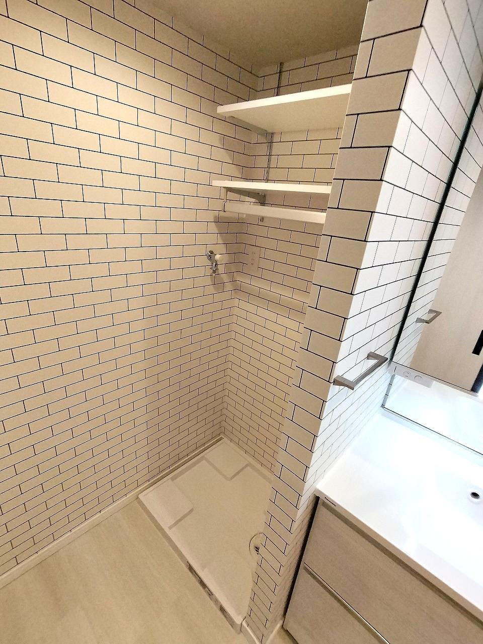 洗濯機防水パンも新規で交換済みです。上部には棚も完備されています。