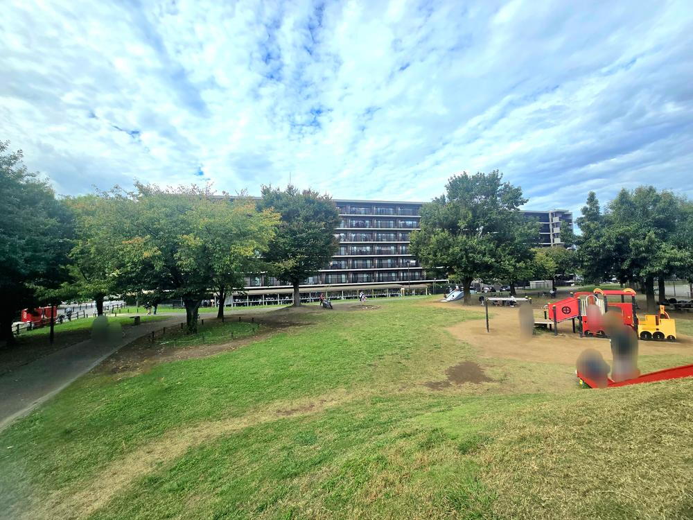「新鶴見公園」側から見た現地外観。空と緑に恵まれた住環境に住まう。現地(2025年10月)撮影