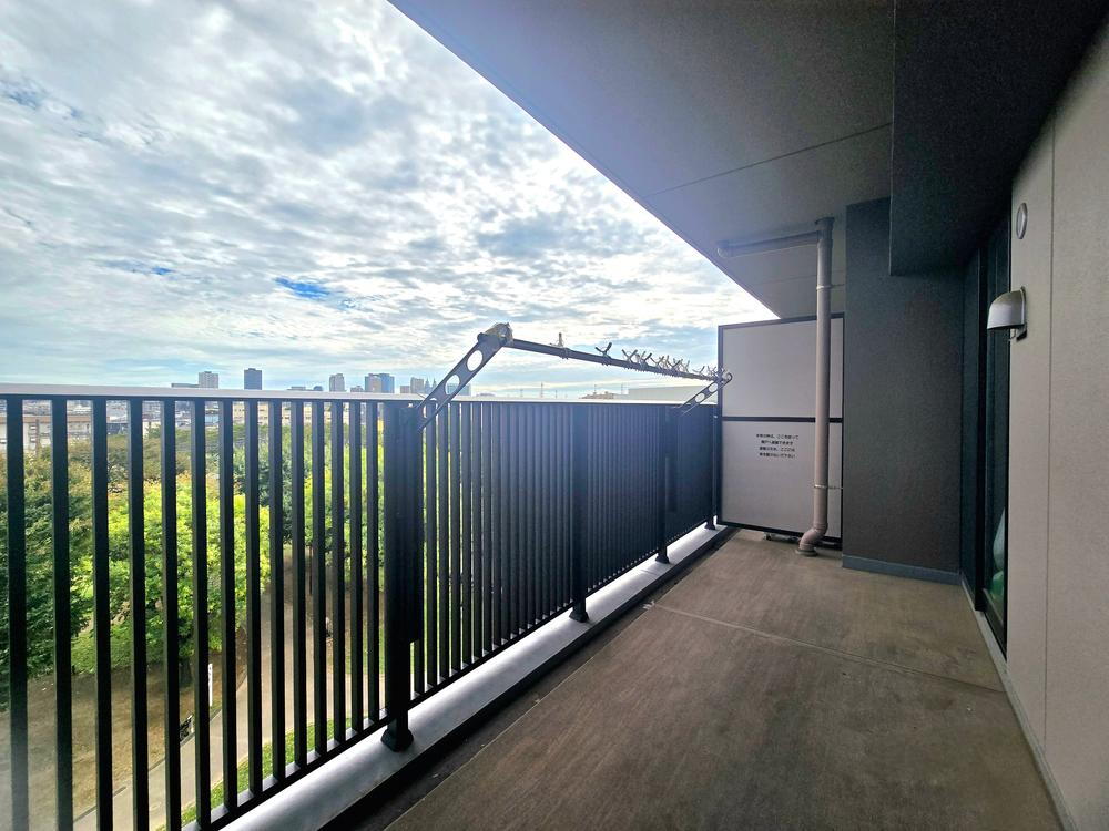 奥行約1.7mの幅を有するバルコニー、たっぷり洗濯物を干すことはもちろん、そこから広がる開放的な雰囲気もありがたいポイント。現地バルコニー(2025年10月)撮影