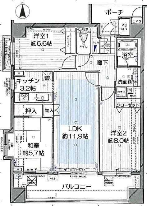 専有面積77.59m2(23.47坪)(壁芯)