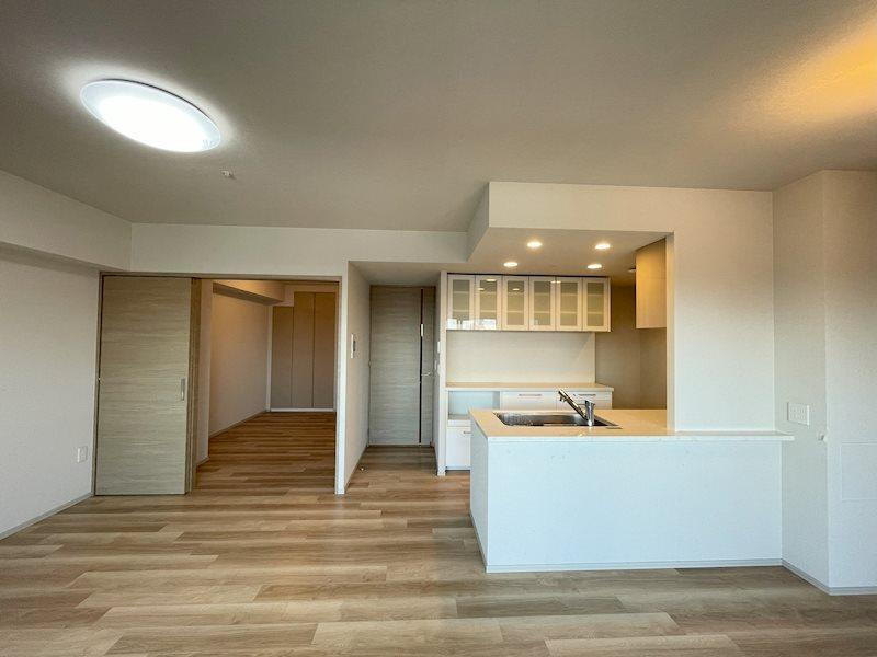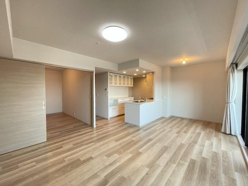 リビングダイニングは、明るい木目調フローリングと白壁で統一された、清潔感と温かみあふれる空間です。隣接する洋室との引き戸を開放すれば、生活シーンに合わせたフレキシブルな使い方が可能です。