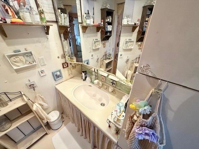 開き鏡の中が収納スペースになっていて清潔感のある洗面台になっています♪