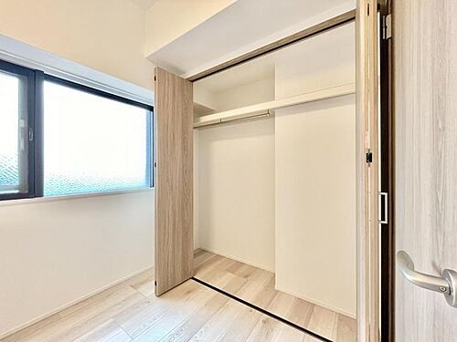 【収納】陽射しが気持ちよく差し込む洋室。お気に入りの洋服を丁寧にしまうことができる収納も完備