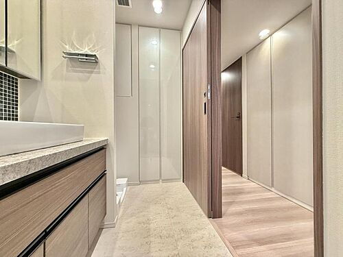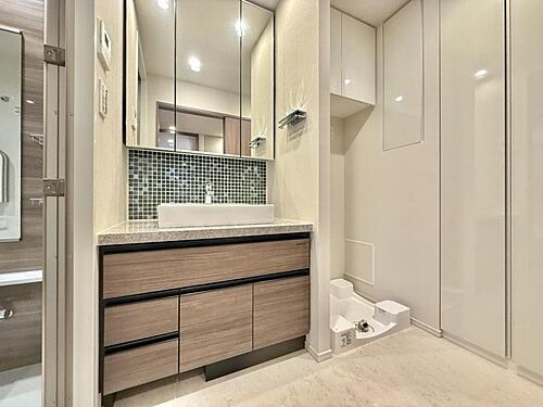 【脱衣所】大きな三面鏡の洗面台。日用品のストックも十分できる収納も備わっています
