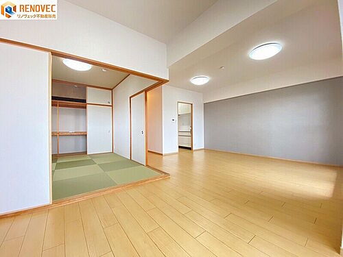 【和室】◆約6.0帖の和室です◆すぐに横になれる和室は、みんながほっと一息つける空間◆リビングに面した和室は重宝します◆和モダンな「縁無し畳」がいいですね♪