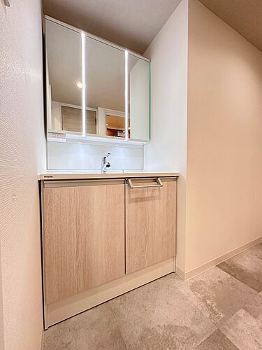 【洗面台】 十分な大きさの洗面台は、身だしなみチェックや歯磨きなど、朝の慌ただしい時間でもホテルライクなスペースで余裕とゆとりを感じて頂けます。