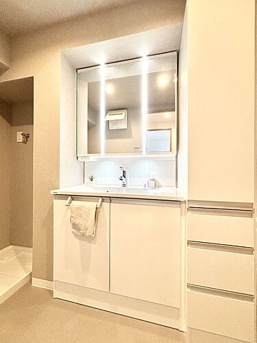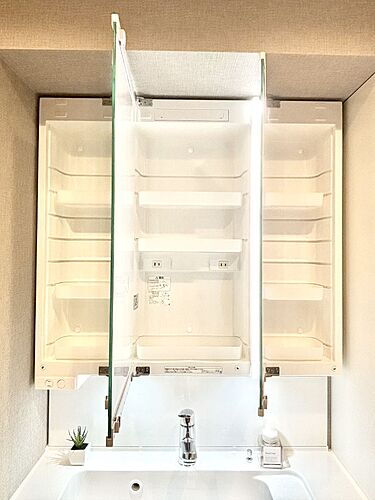 三面鏡の裏に、化粧品や衛生用品などを収納可能。洗面台をすっきりと保ちます!