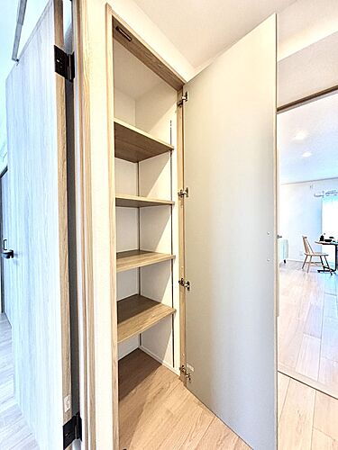 廊下収納。掃除道具や季節の小物を収納することができます。