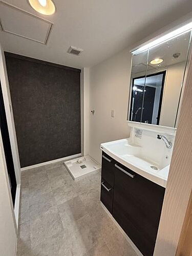 ゆったりとした洗面所で落ち着いたカラーリングが特徴です。鏡付きの独立洗面台もございます。清潔感のある空間設計が魅力です。