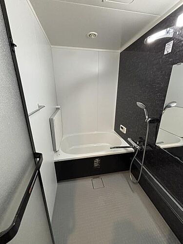 シンプルで落ち着いたデザインのバスルームです。壁面のコントラストが空間を引き締めます。お手入れしやすい仕様となっています。
