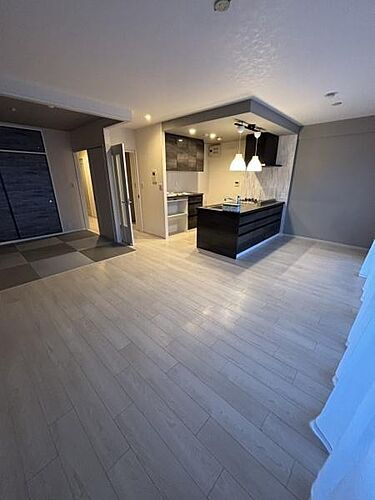 リビング空間が魅力です。対面式キッチンとの一体感がありゆったりとした雰囲気を感じられます。落ち着いた色合いの床材と壁紙が調和し洗練された印象を与えます。