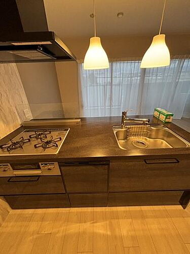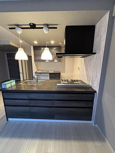 シックな色合いのキッチンが空間に落ち着きをプラスします。使いやすいガスコンロとシンクが配置されています。照明が柔らかな雰囲気を演出しています。収納スペースも豊富で整理がしやすい仕様です。