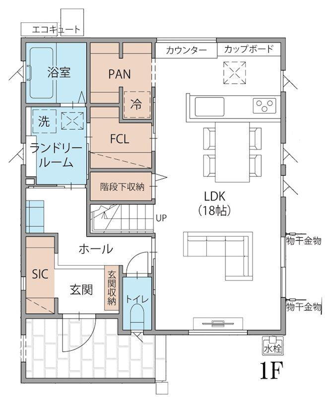 【1階間取り図】18帖のLDKにリビング階段を採用!キッチンにはカウンターを設置し、作業にも便利。