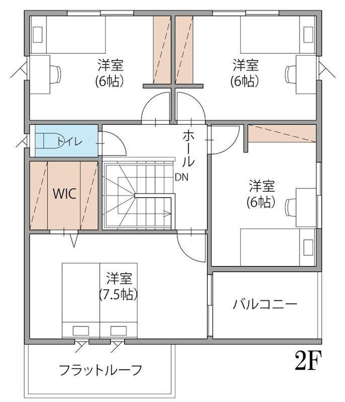 【2階間取り図】2階はすべて6帖以上の4部屋。洋室(7.5帖)にはWICを完備で、収納も充実。