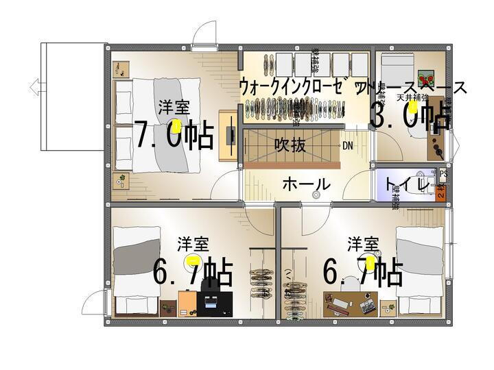 さらに3帖のフリースペースがあり、書斎や納戸、ランドリールームとしても大活躍。 -