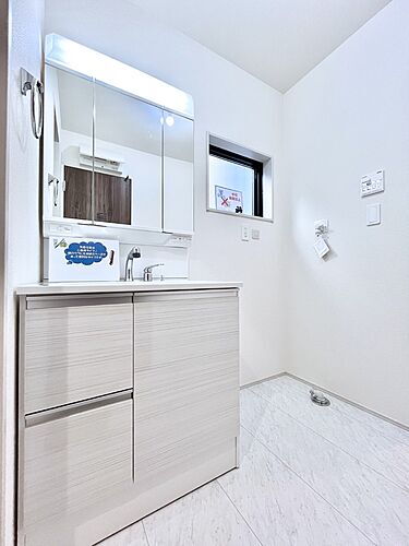 大きく見やすい三面鏡で清潔感ある洗面台は、身だしなみチェックや肌のお手入れにおすすめです。