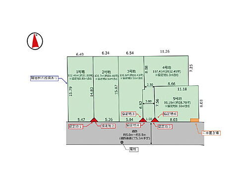 ※接道状況/南側約5.0m公道 ※1号地:有効敷地面積102.49 越境除外あり 2号地:実測100.7 3号地:実測100.06 4号地実測107.41 5号地:95.19 ※1・2・3・5号地:協定地0.50 含む ※4号地:協定地1.00 含む ※5号地ごみ置き場設置予定(1.57 持分1/5ずつ) 【設備・特記事項備考】建築条件なし