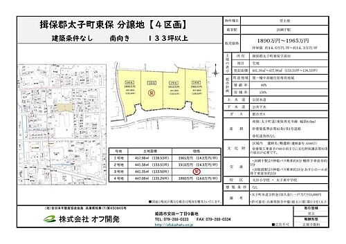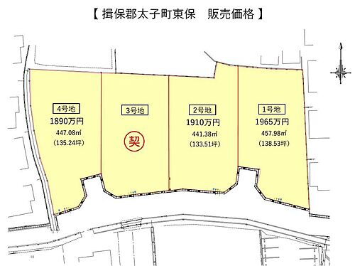 全4区画 建築条件なし 1890万~1965万(坪単価約14.0万~約14.3万)441.38平米~457.98平米(約133.51坪~約138.53坪)