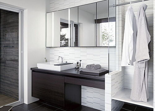 施工例 スタイリッシュな洗面化粧台。三面鏡になり、裏には洗面用品など収納できます。ハンドシャワー付。