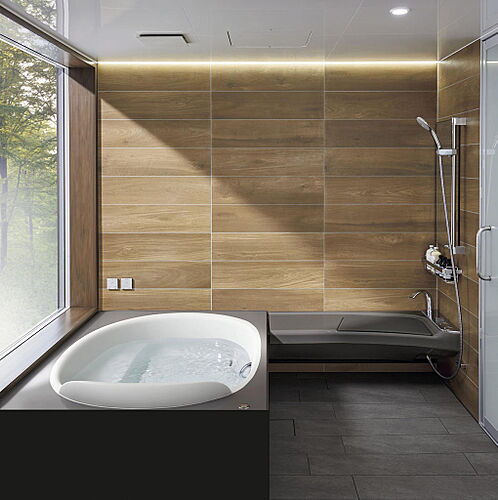 施工例 ゆっくりと一日の疲れを癒やせる一坪タイプの浴室。浴室暖房乾燥機付で雨の日なども楽々お洗濯。