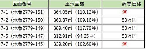 ※先着順販売の為、売約済みの場合がございます。予めご容赦ください。※坪表示は1平方メートル=0.3025坪で換算し、小数点第3位以下は切り捨てとしました。※掲載の区画図は 7-2 360.87(109.16坪) 7-3 389.40(117.79坪) 7-5 312.91(64.65坪) 7-7 339.20(102.60坪) 4区画になります。