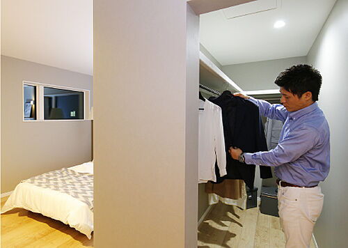 【主寝室】主寝室の入り口近くにある扉のないウォークインクローゼット。遅く帰った日、ウォークインクローゼットで部屋着に着替えてファミリースペースでリラックスしてもクローゼットの開け閉めで先に休んでいる家